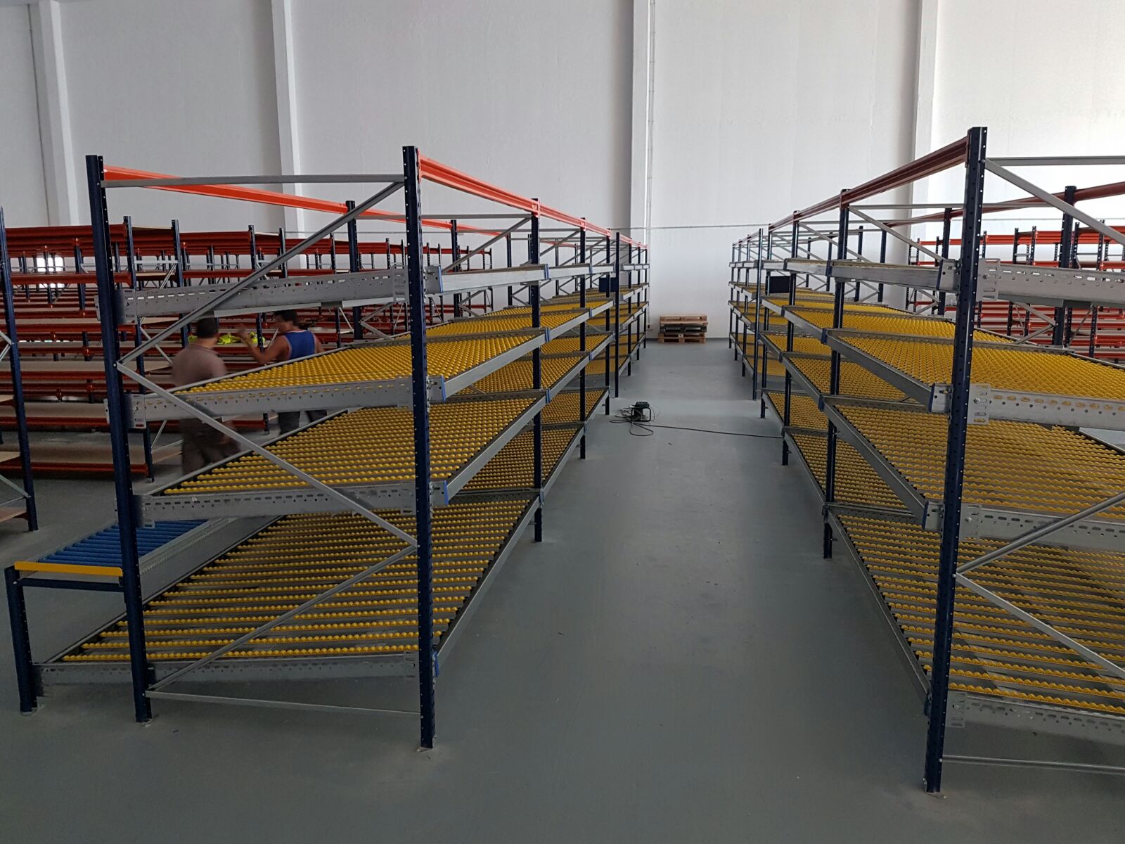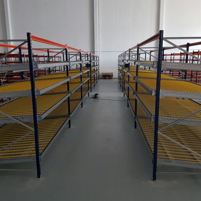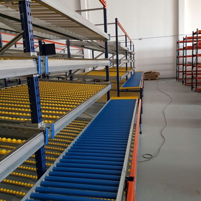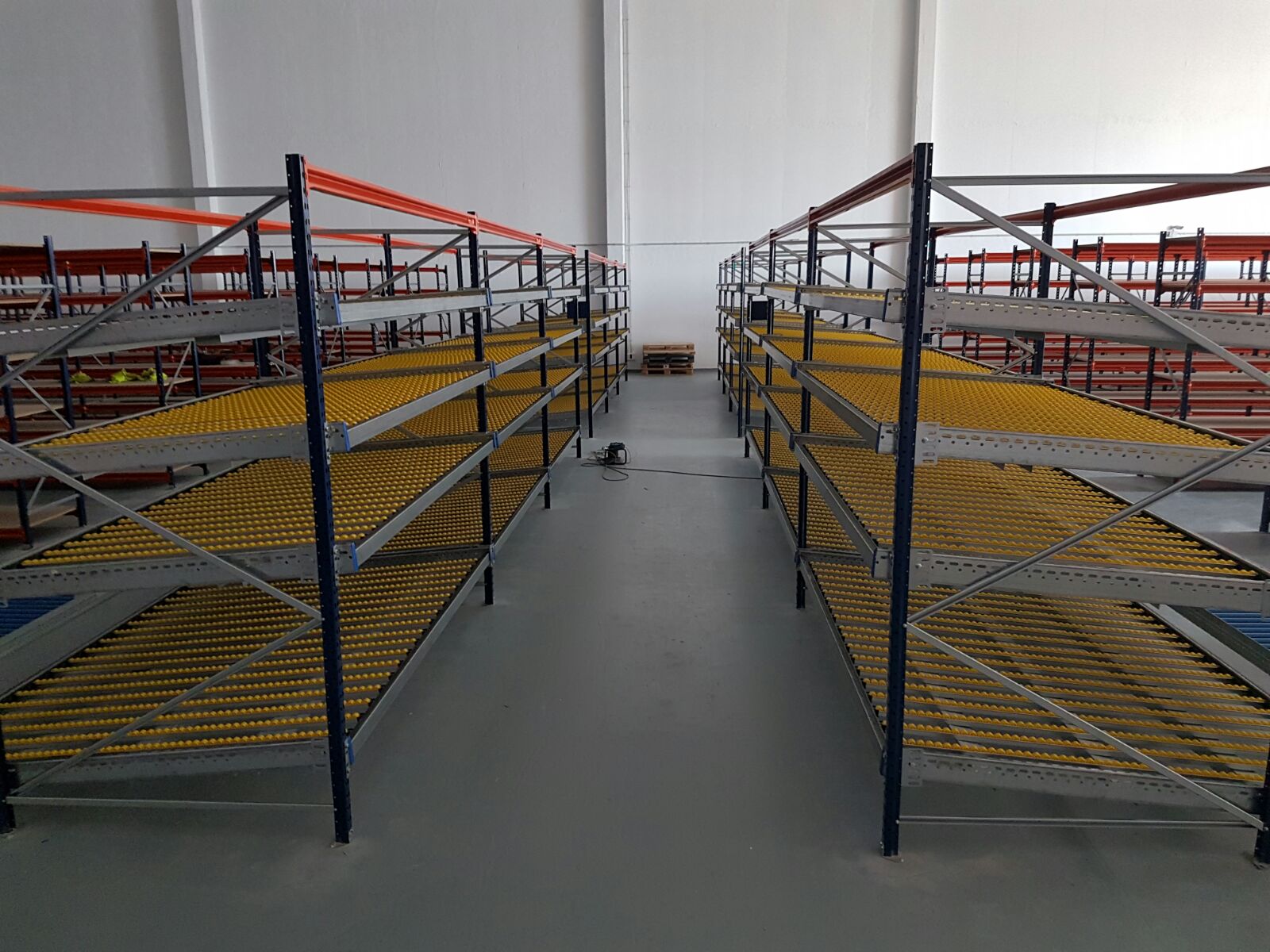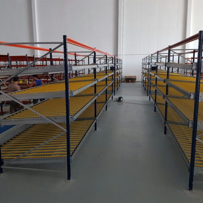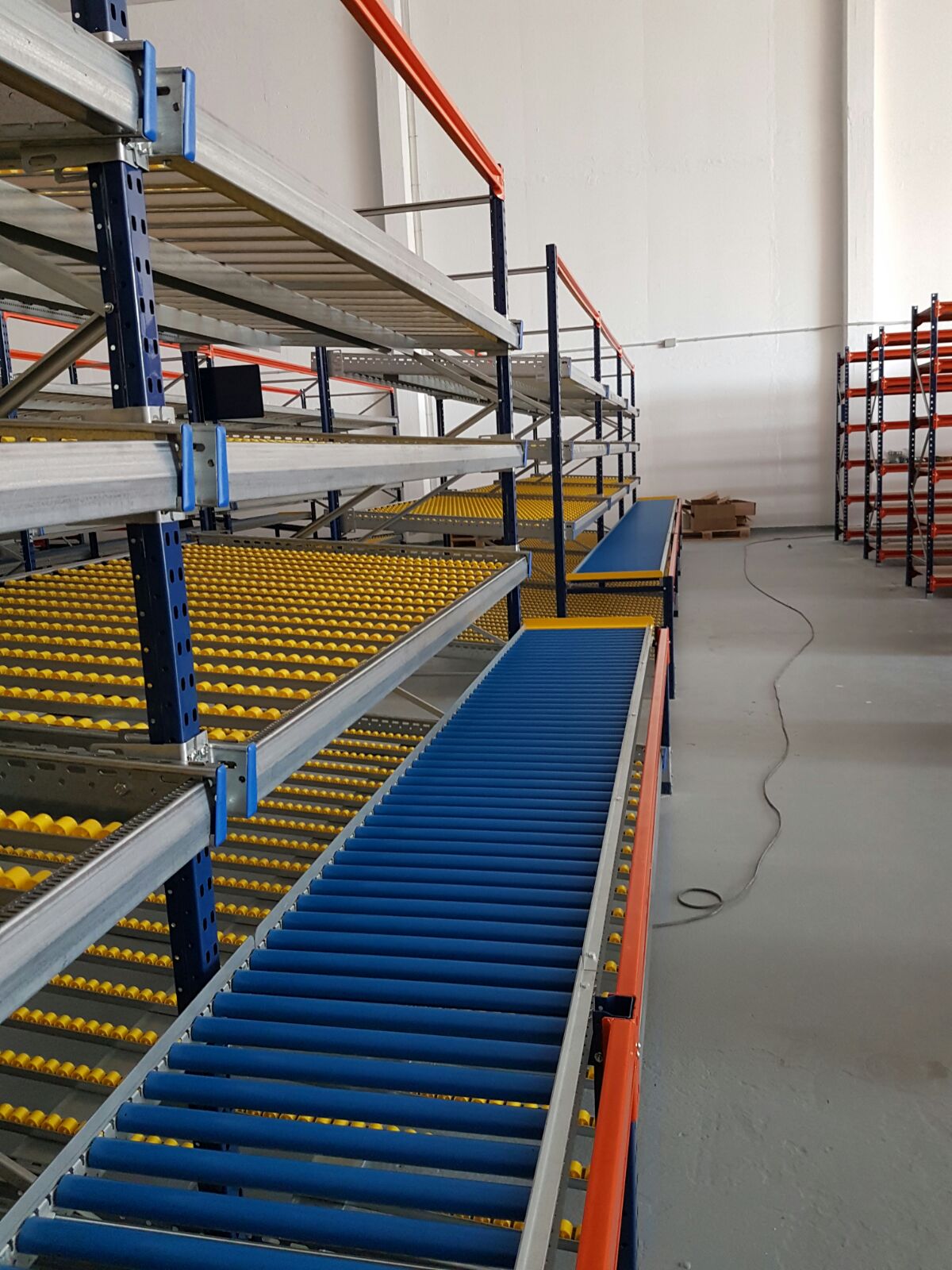 Гравитачните стелажи представляват конвенционална система „Long Span”, на която рафтовете се монтират поднаклон и върху тях се поставят ролкови пътища.
